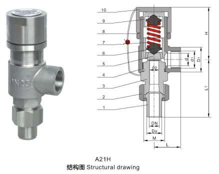 A21H弹簧微启式外螺纹安全阀适用于工作温度≤200℃的空气、氨、石油气等介质的设备和管路上。A21W型适用于工作温度≤200℃含腐蚀性的气体或液体的设备和管路上,A21F型适用于工作温度≤200℃的液化气、石油气等设备和管路上,作为超压保护装置。当设备和管路内压力超过允许值时,阀门自动开启,继而全量排放;当压力降低到规定值时,阀门自动关闭,保证设备和管路安全运行。
